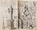 Manuscrit in-folio (34 x 22,5 cm) de 113 feuillets sur papier vergé comprenant (5) ff. blancs, 113 planches de dessins originaux de N.Weiss, 2 planches gravées d’après des dessins de J.de Sandrart, (64) pages dont le titre écrites à l’encre noire. Demi-basane anciennement recouverte de papier marbré, fermeture à lacets de cuir blanc, étiquette collée avec titre manuscrit à l’encre sur le premier plat. (reliure de l’époque usagée). Mouillures, déchirures et salissures sans atteinte majeure au texte et aux dessins.