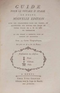 Guide pour le voyage d’Italie en Poste. Nouvelle édition avec les changemens dans les postes, et augmentée des routes des états de terre Ferme de S.M. le Roy de Sardaigne et des Regles a observer pour le passage du Montcenis. Texte en Français et en Italien en regard pour le titre, en double colonnes pour le texte. Prix qu’on paye pour les chevaux dans chaque Etat. Table. Avis (VIII pages).