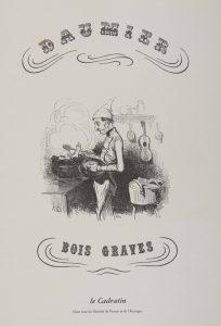 Paris, Le Cadratin – Jacques Lecat, Paris, 1985. In-fol. non paginé, Nombreuses reproductions in-t. et 80 reproductions des gravures de Daumier contrecollées sur papier noir. Plein maroquin, dos lisse. Premier plat décoré d’une sarabande de personnages polychromes et au centre H. Daumier en lettres dorées. Dos lisse orné d’un personnage polychrome et or en queue, Titre en long aux lettres formées par de petits personnages dorés; tête dorée. Roulette dorée. Tirage original limité à 1900 exemplaires numéroté, celui-ci exemplaire Hors-Commerce. Sous étui carton. Très bon état.