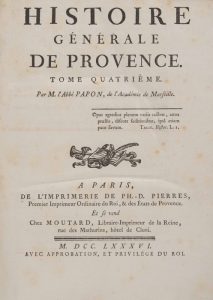 Paris, Moutard Libraire-Imprimeur – Imprimerie Ph.-D. Pierres, 1777- 1778-1784-1786. 4 vol. In-4, (20x25,5cm), XXXVI-689p.-(4p. privilège + errata)+(2)XVI-630p.-(2p. errata)-C+(2)-XVI-683p.(1p.errata)-LXXX- 14p.+(2)-XIV-864p.-(2p. privilège+errata). Demi-basane sommaire d’époque. Complet des 2 cartes de la Provence rempliées au t. 1 et au total 18planchesh-t.:5aut.1;7aut.2;6aut.3.Quelquesbandeauxetculs- de-lampes. Bien complet de ses 2 « Supplément à l’Histoire Générale de Provence » aux t. 2 et 3, ainsi qu’un 3ème suppl. intitulé « La relation du Tournois célébré àTarascon en juin 1449 ». Assez bon état,coiffes et coins abîmés, mors fendu. Rousseurs éparses.