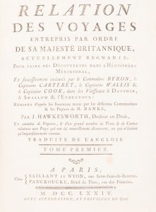 BYRON, le Capitaine CARTERET, le Capitaine WALLIS & le Capitaine COOK, dans les vaisseaux le Dauphin, le Swallow, & l’Endeavour : rédigée d’après les journaux tenus par les différens commandants & les papiers de M. BANKS, par J. HAWKESWORTH, Docteur en droit, et enrichie de figures, & d’un grand nombre de plans & de cartes relatives aux pays qui ont été nouvellement découverts, et qui n’étaient qu’imparfaitement connus.Traduit de l’anglais.