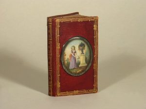 [ALMANACH]. Les Jeux de Polymnie et d'Erato. Paris, Janet, An V [1796]. In-16, maroquin rouge, miniatures peintes sous verre différentes sur chaque plat, dos lisse orné, miroir et soufflet intérieurs, tranches dorées (Reliure de l'époque).