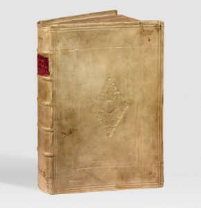 3 ouvrages en un volume in-4, vélin rigide estampé à froid, double encadrement de filets avec fleurons d'angles et médaillon central, dos à nerfs, pièce de titre de maroquin rouge, tranches jaspées (Reliure hollandaise de l'époque).