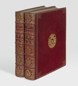 2 volumes in-4, maroquin rouge, triple filet doré, fleurons filigranés aux écoinçons, armoiries au centre, dos orné des mêmes armoiries répétées, roulette sur les coupes, dentelle intérieure dorée, tranches dorées sur marbrure (Reliure de l'époque).