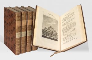 HIRSCHFELD (Christian Cay Lorenz). Théorie de l’art des jardins. Leipzig, héritiers de M. G. Weidmann et Reich, 1779-1785. 5 volumes in-4, basane marbrée, dos lisse orné, tranches jonquille (Reliure de l'époque).