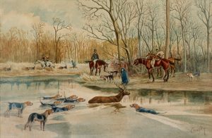CRAFTY. Chasse à courre. Bat-l'eau. Aquarelle et gouache signée