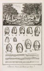 Charron, Chasses, Chaudronnier, Chimie, Chirurgie, Chorégraphie, Cirier, Ciseleur, Cloutier, Coffretier, Confiseur, Corderie, Cordonnier, Corroyeur, Coutelier, Découpeur d'étoffes, Dentelle, Dessin, Diamantaire, Distillateur, Doreur, Draperie. La section sur la chasse, notamment, se compose de 23 planches gravées par Bénard d'après Goussier. Bel exemplaire bien relié à l'époque.