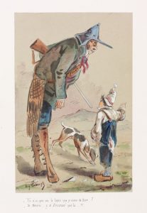 Suite de caricatures aquarellées sur les chasseurs du dimanche, composée d'un titre-frontispice à pleine page, de vingt-quatre planches montées sur vélin et légendées et de la signature de l'artiste à pleine page.