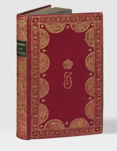festonnée de douze demi-cercles dorés au pointillé contenant chacun une aigle impériale, chiffre couronné au centre, dos lisse orné de fleurons sur fond pointillé, pièce de titre de maroquin vert, coupes guillochées, grecque intérieure dorée, doublures et gardes de moire verte, tranches dorées (Bozérian).