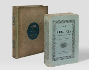 de papier blanc gravé en relief par le procédé Bauerkeller, médaillon portant le titre Paul et Virginie et La Chaumière indienne blanc sur fond bleu au centre du premier plat, médaillon fleuri blanc au centre du second, dos recouvert de même papier portant le titre et le nom de l'éditeur, tranches dorées imitant la reliure, intérieur doublé de papier rose, rubans intérieurs roses et vert (Reliure de l'éditeur).