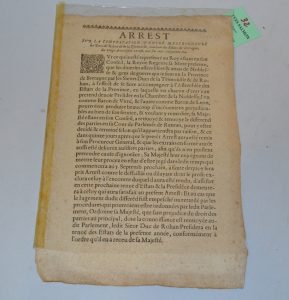 [ESTATS DE BRETAGNE - MORBIHAN] - Arrest sur la contestation d'entre Messeigneurs les Ducs de Rohan et de La Trimoüille, touchant les Estats de Bretagne, du 22 août 1651. 1 pp. imprimée gd in-4. Beau document.