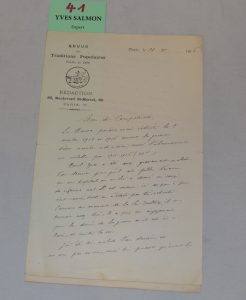 • L.A.S. Adressée à « Mon cher compatriote » de 2 pp. in-8 du 22 VI 1916, lui annonçant la maladie de Paul-Yves [son fils] et la sienne l'année précédente et espère la fin de la guerre « plus tôt qu'on ne le croyait il y a quelques mois ».
