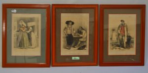 GRAVURE [LALAISSE] - • Pêcheurs de sardines lorientais (légères piqûres). Ft 19x28,5 • Femmes de Josselin. Ft 19x28 • Fermiers aisés de Plumeliau (Morbihan). (légères rousseurs) Ft 20x29 3 gravures encadrées en couleurs dessinées et...
