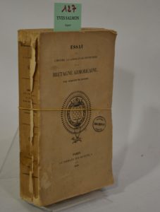 COURSON (Aurélien de) - Essai sur l'histoire, la langue et les institutions de la Bretagne Armoricaine. 1 fort vol. de XXVIII-578-[1] pp. gd in-8 broché. Paris Le Normant 1840. Dos cassé sinon bel état intérieur non coupé.