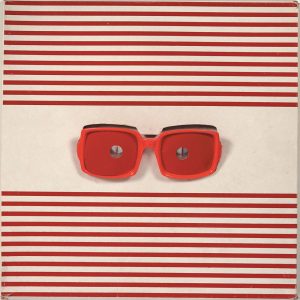 Publication Pop, emboîtage original en carton contenant une paire de lunettes en plastique orangé.