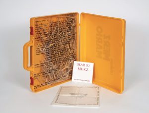 MERZ Mario. The catalogue in a suitcase. Amsterdam, Parade, 1993. Valise de plastique jaune portant le titre.