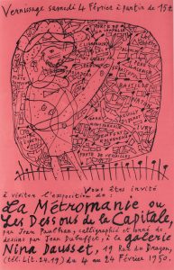 Affichette sur papier rose entièrement lithographiée par Jean Dubuffet invitant à l'exposition de son ouvrage La Métromanie ou les dessous de la capitale. Superbe état.