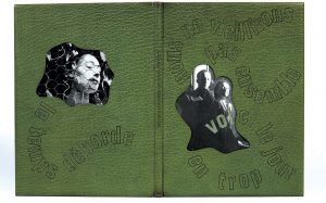 [ÉLUARD Paul]. DESROCHES Didier. LE TEMPS DEBORDE. Paris, Cahiers d’Art, 1947. Grand in-8, plein maroquin vert bouteille portant sur les deux plats un découpage laissant apparaître deux photographies et cette phrase gravée à froid : « Nous...