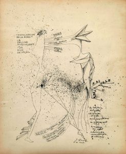 Dessin original à l'encre signé avec légendes, en hommage au poète mauricien Malcolm de Chazal représentant les personnages masculins et féminins de l'univers de Herold.
