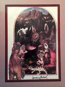 Beau collage original signé à l’encre au recto par Jacques Prévert, représentant au premier-plan une femme nue entourée de diverses images de l’univers de Prévert.