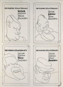 Affiche illustrée de quatre caricatures des « Bevriend Staatshoofd » représentant Hitler, Johnson, Nixon et Soeharto conçue par Willem (Bernard Holtrop).