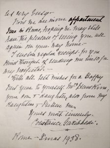Lettre autographe de voeux de Constance Garibaldi, veuve de l'homme politique, de deux pages adressée à Mr et Mme Hawkins en Anglais datée 1938. On y joint trois cartes postales de l'Hôpital Giuseppe Garibaldi, l'une avec envoi autographe de...