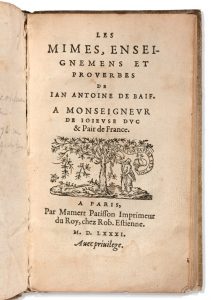 BAIF (Antoine de). Les mimes, enseignement et proverbes. Paris, Mamert Patisson, 1581, in-16, 6 ff. -108 ff. - 1 f. bl., vélin, traces de lacets.