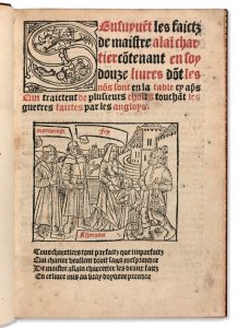 CHARTIER (Alain). SENSUYUENT LES FAICTZ de Maistre Alain Chartier contenant en soy douze liures dont les noms sont en la table cy après. Qui traictent de plusieurs choses touchant les guerres faictes par les anglais. Paris, JehanTrepperel & Jehan...