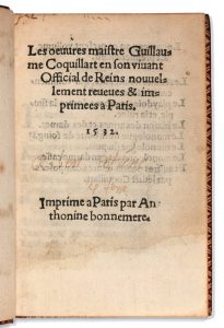 COQUILLART (Guillaume). Les œuvres de maître Guillaume Coquillart en son vivant, official de Reims. Nouvellement revue et imprimée à Paris. Paris, Anthonine Bonnemere, 1532, in-16, 158 pp., (a2-u4), maroquin rouge, triple filets encadr. les...