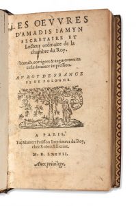 JAMYN (Amadis). Les œuvres d’Amadis Jamyn, secrétaire et lecteur ordinaire de la chambre du Roy. Revues, corrigées & augmentées en cette dernière impression. Paris, Chez Robert Estienne, 1582, in-12, 4 ff. - 309 pp. - 11 ff.- 1 f. bl., mar....