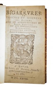 TABOUROT (Etienne). Les bigarrures et touches du seigneur des accords. Rouen, , 1628. 5 parties en un volume in-12, maroquin rouge, dos lisse orné, filets dorés encadrant les plats, tranches dorées (reliure de l'époque). Rare édition rouennaise...