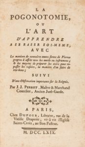 1769. LIBRO. (ARTE-BARBERÍA). PERRET, J. J.: LA POGONOTOMIE OU L'ART D'APPRENDRE A SE RASER SOI-MEME, avec la maniere de connoître toutes fortes de Pierres.. Paris: Ed. Dufour, 1769. 8º menor.