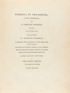 1812. LIBRO. (ARTE-GRABADO). FLORILLO, DOMINICO IO.: PARERGA ET ORNAMENTA, CAELO EXPRESSA, AD P. VIRGILII MARONIS OPERA ILLUSTRANDA. Londini: Chr. Gottl. Heyne, 1812. 4º mayor. h. + 74 grabados + 31 p. enc. en media piel puntas, nervios, corte...