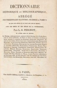 1821-1822. LIBRO. (BIBLIOFILIA). PEIGNOT, L. G.: DICTIONNAIRE HISTORIQUE ET BIBLIOGRAPHIQUE, ABRÉGÉ DES PERSONNAGES ILLUSTRES, CÉLÈBRES OU FAMEUX.. Paris: Libr. Haut-Coeur et Gayet, 1822. 4 vol. en 8º mayor.