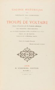 1861. LIBRO. (BIBLIOFILIA-HISTORIA). HILLEMACHER, FREDERIC ; MANNE, E. D. : GALERIE HISTORIQUE DES PORTRAITS DES COMÉDIENS DE LA TROUPE DE VOLTAIRE. Lyon : Ed. N. Scheuring, 1861. 8º mayor.