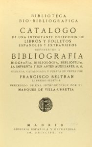 1927. LIBRO. (BIBLIOGRAFÍA). BELTRAN, FRANCISCO: BIBLIOTECA BIO-BIBLIOGRÁFICA. CATALOGO DE UNA IMPORTANTE COLECCIÓN DE LIBROS Y FOLLETOS ESPAÑOLES Y EXTRANJEROS REFERENTES A BIBLIOGRAFÍA, BIOGRAFÍA, BIBLIOLOGÍA, BIBLIOFILIA, LA IMPRENTA Y SUS...