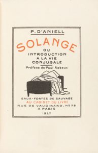 1927. LIBRO. (BIBLIOFILIA-EROTICA). D'ANIELL, P. : SOLANGE OU INTRODUCTION À LA VIE CONJUGALE. Prefacio de Paul Reboux. Paris: Imp. E. Taffard, 1927. 8º mayor.