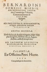 1579. LIBRO. (CIENCIA-SAL). GOMESII MIEDIS, BERNARDINI : COMMENTAROPRUM DE SALE LIBRI QUINQUE. Valentiae : Ex Officina Petri Huete, 1579. 8º mayor.
