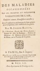 1752. LIBRO. (MEDICINA). RAULIN, JOSEPH : DES MALADIES OCCASIONNÉES PAR LES PROMPTES ET FREQUENTES VARIATIONS DE L'AIR.. Paris : Chez Huart & Moreau, 1752. 8º menor.