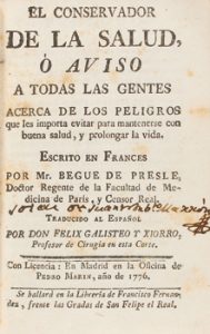 1776. LIBRO. (MEDICINA). PRESLE, BEGUE DE : EL CONSERVADOR DE LA SALUD, Ó AVISO A TODAS LAS GENTES ACERCA DE LOS PELIGROS que les importa evitar para mantenerse con buena salud, y prolongar la vida. Madrid : Pedro Marin, 1776. 8º menor.