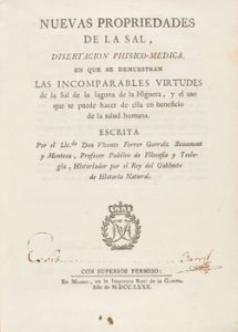 1780. LIBRO. (MEDICINA). GORRAIZ BEAUMONT MONTESA, VICENTE FERRER : NUEVAS PROPIEDADES DE LA SAL, DISERTACION PHISICO-MEDICA, EN QUE SE DEMUESTRAN LAS INCOMPARABLES VIRTUDES de la Sal de la laguna de la Higuera, y el uso que se puede hacer de ella...