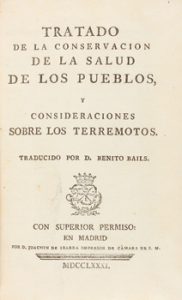1781. LIBRO. (MEDICINA). TRATADO DE LA CONSERVACION DE LA SALUD DE LOS PUEBLOS Y CONSIDERACIONES SOBRE LOS TERREMOTOS. Trad. Benito Bails. Madrid : Joachin de Ibarra, 1781. 8º menor.