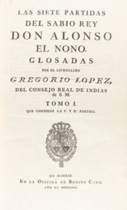 1789. LIBRO. (DERECHO). ALFONSO EL NONO : LAS SIETE PARTIDAS DEL SABIO REY DON ALONSO EL NONO, GLOSADAS POR EL LICENCIADO GREGORIO LOPEZ DE TOVAR. Madrid : Benito Cano, 1789. 4 vol. en gran folio.