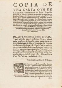 1624. FOLLETO. (MILITARIA-ESCLAVOS). RUIZ DÍAZ DE VILLEGAS, FRANCISCO : COPIA DE UNA CARTA QUE DE LA CIUDAD DE PALERMO EMBIO EL CAPITAN FRANCISCO.. A DON JUAN VIDAURRE DE ORDUÑA, ENTRETENIDO POR SU MAGESTAD EN ESTA CORTE.. EN QUE SE HAZE RELACIÓN...