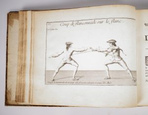 GIRARD (Pierre-Jacques-François). Nouveau traité de la perfection sur le fait des armes. Paris, 1736. In-4 oblong, demi-veau brun à coins, dos à nerfs, pièce de titre de maroquin rouge (reliure de l'époque). Première édition. L'illustration...