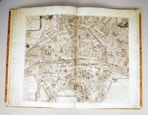 de titre de maroquin rouge, grande vignette de maroquin rouge avec titre frappé or posé sur le premier plat (reliure à l'imitation). Ouvrage comprenant un titre et 8 plans gravés à double page par Nicolas De Fer, illustrant l'évolution historique de la ville de Paris depuis Lutèce jusqu'en 1643. Le dernier plan montre l'état de la ville à la fin du règne de Louis XIV. Bon exemplaire. Mouillure au titre.