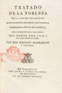 1788. LIBRO. (GENEALOGÍA-HISTORIA ESPAÑA). MADRAMANY, MARIANO : TRATADO DE LA NOBLEZA DE LA CORONA DE ARAGON, ESPECIALMENTE DEL REYNO DE VALENCIA, COMPARADA CON LA DE CASTILLA, PARA LA ILUSTRACIÓN DE LA REAL CEDULA DEL SEÑOR DON LUIS I DE 14 DE...