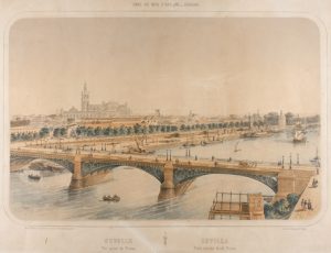1800 ca. GRABADO. SEVILLA. DEROY, A. : PORT DE MER D'EUROPE. ESPAGNE. SEVILLA. VUE PRISE DE TRIANA. Paris : Imp. L. Turgis, 1800 ca. Litografía coloreada de las vistas del puerto de Sevilla. 43 x 59 cm.