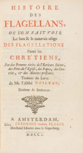 1701. LIBRO. (HISTORIA). HISTOIRE DES FLAGELLANS, OU L'ON FAIT VOIR LE BON & LE MAUVAUS USAGE DES FLAGELLATIONS PARMI LES CHRÉTIENS.. Traducción del Abad Boileau. Amsterdam : Francois vander Plaats, 1701. 8º menor.
