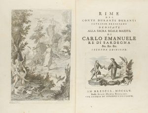 1755. LIBRO. (HISTORIA-ITALIA). DURANTI DURANTE : RIME DEL CONTE DURANTE DURANTI PATRIZIO BRESCIANO. DEDICATE ALLA SACRA REALE MAESTÀ DI CARLO EMANUELE RE DI SARDEGNA. Brescia : presso Gian-Maria Rizzardi, 1755. 4º menor.